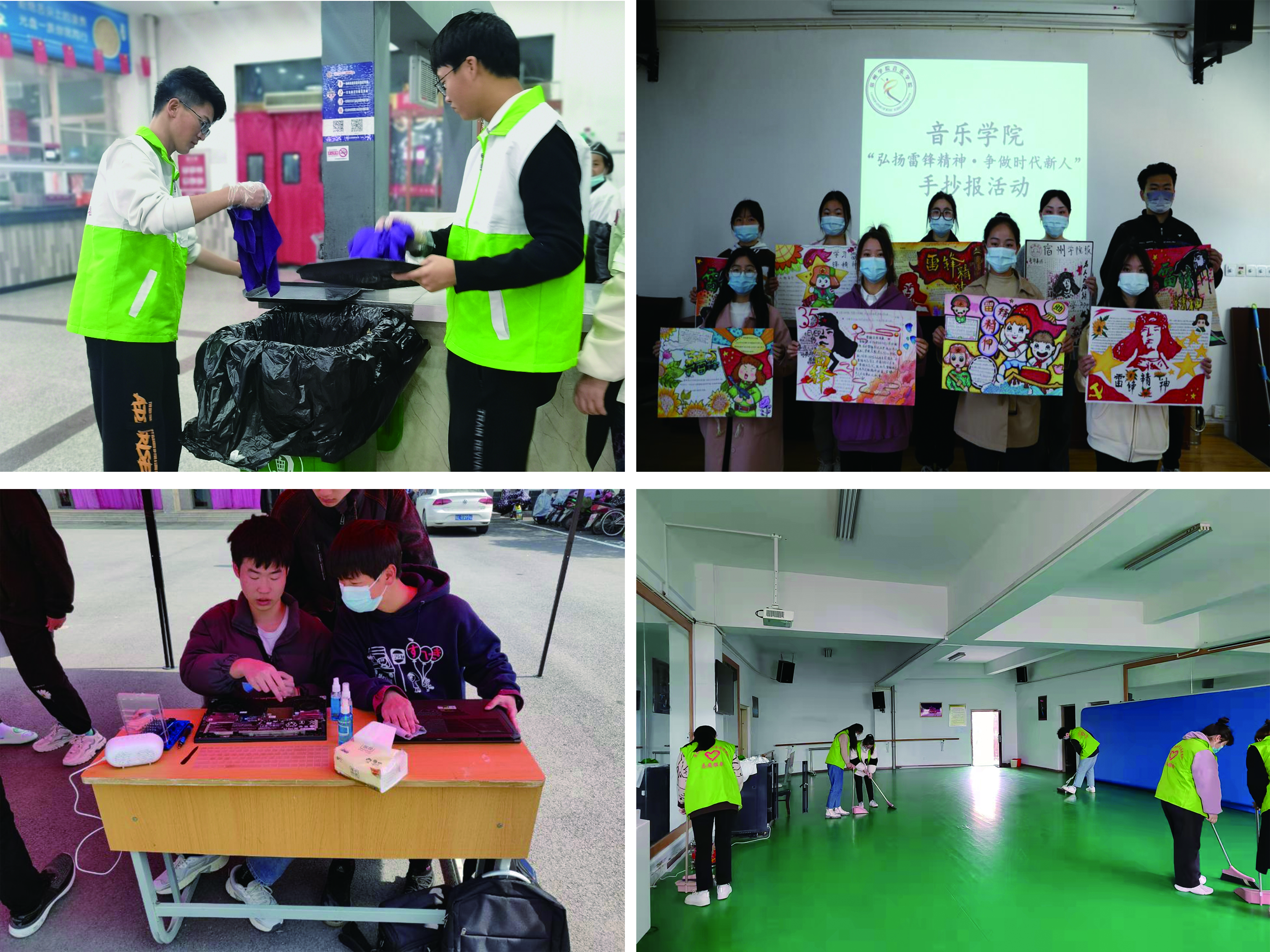 宿州学院青年志愿者总队在一食堂组织开展了“角色互换”活动,志愿者们有的端托盘收拾餐桌,有的拿扫把清扫地面,以饱满的热情,友善的服务,弘扬志愿者精神,增强勤俭节约意识。音乐学院举办了“清洁校园”活动,志愿者们利用周末时间清洁楼宇卫生,为广大师生营造整洁、舒适的学习环境,还精心设计手抄报,对雷锋的生平事迹进行全方位宣传,歌颂雷锋“全心全意为人民服务”的高尚品质。信息工程学院开展了“计算机咨询台志愿活动”,志愿者发挥专业优势,帮扶我校同学进行系统安装和电脑修理等志愿服务。