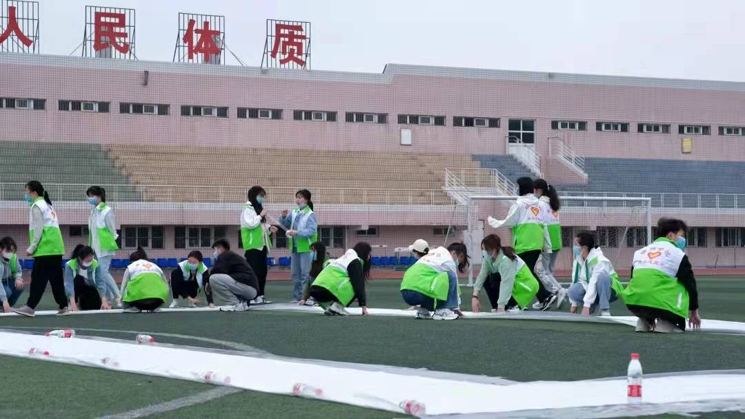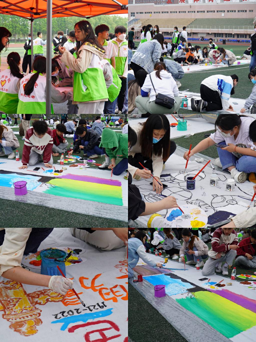 为迎接党的二十大,庆祝建团100周年,4月30日,校团委在东校区田径场举办了“喜迎二十大 百人共书画”百米长卷绘画活动。