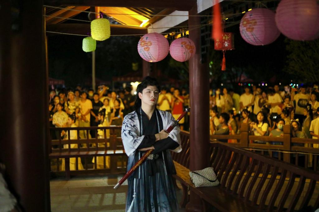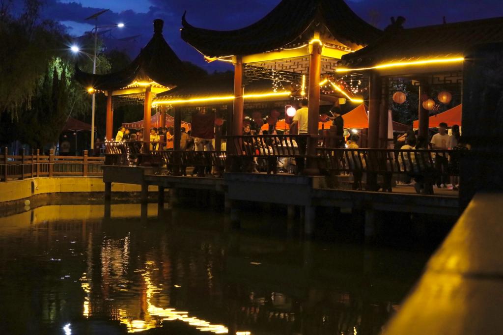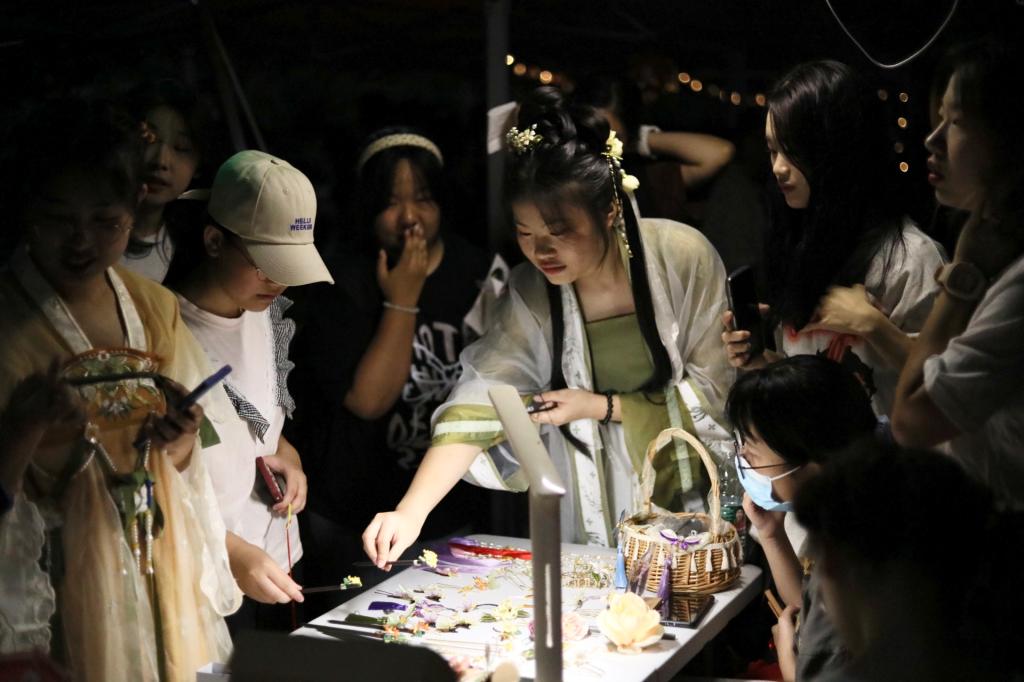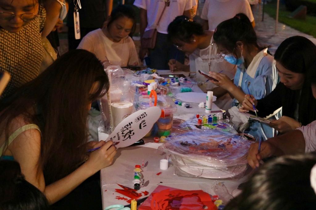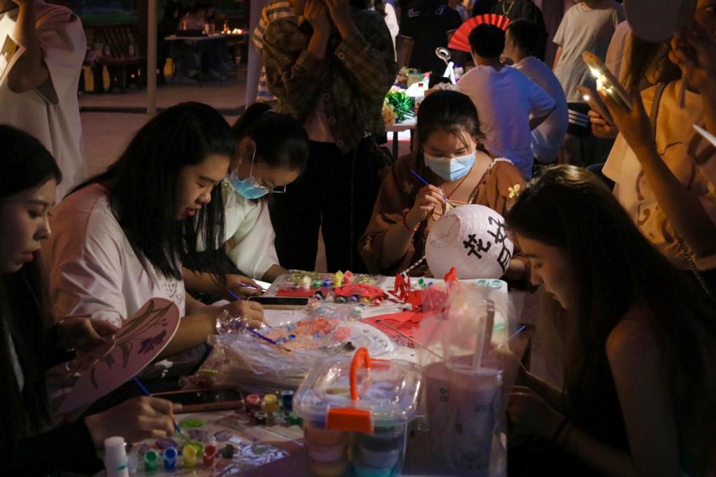 夜色渐起,华灯齐放。天籁吉他社的“唱响中秋”与街舞俱乐部的“舞动中秋”在珍珠湖露天广场用欢快的歌舞调动节日欢快的氛围。沿小路向北而行,文史学会与国学学会共同举办的“花灯手工DIY活动”、“花灯展”、“汉服游园”活动展现古色古香的传统文化魅力。