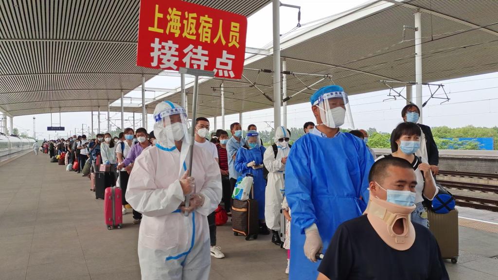7月份宿州市出现疫情暴发,青春战疫服务团第一时间抵达宿州东站,为东站的疫情防控工作添砖加瓦,团队成员听从当地工作人员的安排,为出站旅客进行信息登记,队员们协助车站工作人员完成晚间站前、站内的无死角全方位的消杀工作,对旅客及车站工作人员经常接触的地方如楼梯扶手、门把手、传送带等进行预防性消毒。近40度的高温下,穿着严实的防护服,大汗淋淋打湿衣裳,服务团全体成员不露怯、不退缩、不懈怠,所有工作仍有条不紊的高效进行,坚守在最前方。