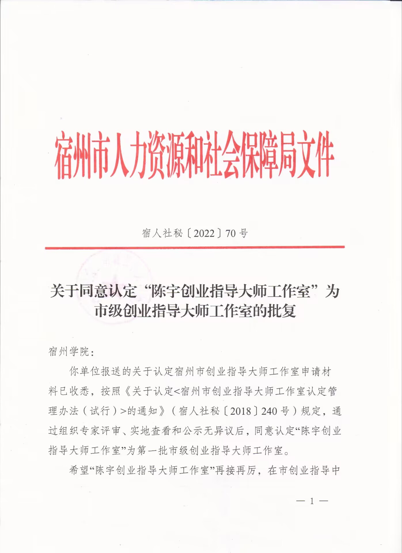 宿州学院“陈宇创业指导大师工作室”被宿州市人力资源和社会保障局认定为宿州市首批创业指导大师工作室,并获10万元资金扶持。
