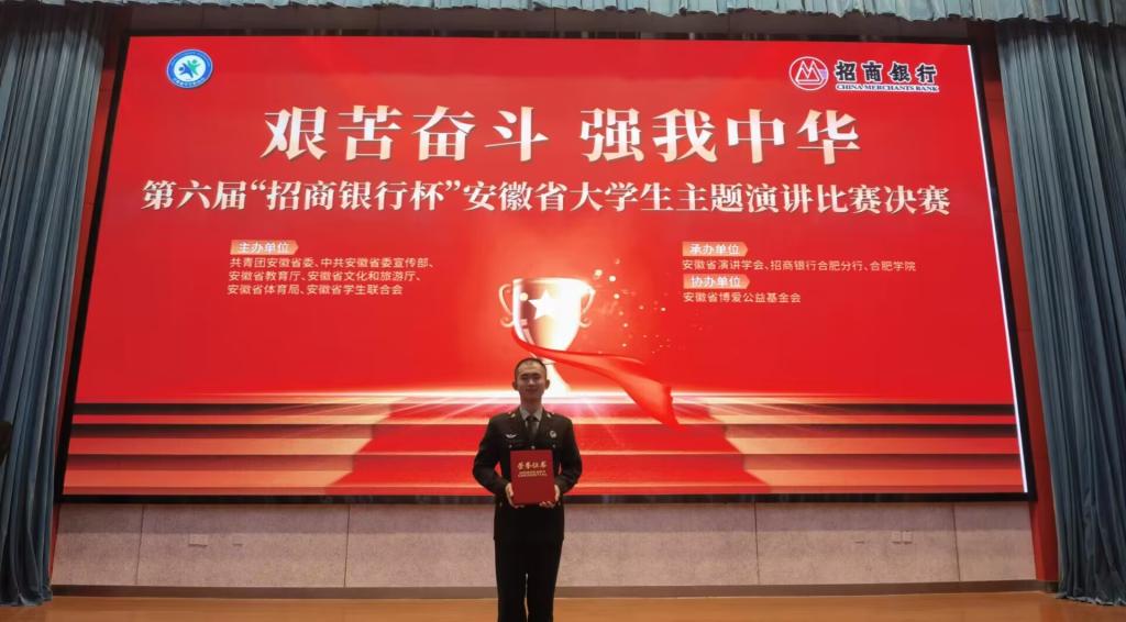 2月25日,第六届“招商银行杯”安徽省大学生主题演讲比赛决赛在合肥学院成功举行,我校推荐的文学与传媒学院温万年同学荣获本科组二等奖。