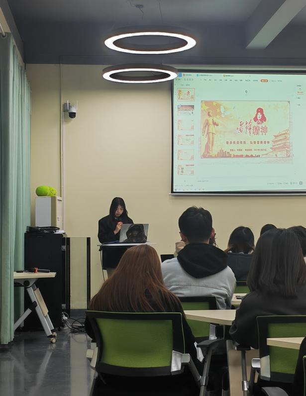 最后,吴雯同学又介绍了雷锋本人,原名雷正兴,出生于湖南长沙,中国人民解放军战士,共产主义战士。1962年8月15日年仅22岁因公殉职。接着阐述了什么是我们代代永传的雷锋精神:热爱党、热爱国家、热爱社会主义的崇高理想和坚定信念;服务人民、助人为乐的奉献精神;干一行爱一行、专一行精一行的敬业精神;锐意进取、自强不息的创新精神;艰苦奋斗、勤俭节约的创业精神。在两位同学都提到雷锋精神,凸显出它的重要性,让我们大家更加的关注。其次讲述雷锋语录:一滴水只有放进大海里才能永远不干,一个人只有当他把自己和集体融合一起的时候才能有力量。力量从团结来,智慧从劳动来,行动从思想来,荣誉从集体来。”最后讲明必须弘扬雷锋精神的重要性:在新时代大力弘扬雷锋精神,就要深刻把握坚守崇高理想、秉持人民情怀、践行奉献精神、投身民族复兴的思想内涵,把崇高的理想信念和道德品质追求融入日常的工作生活,在本职岗位上做一颗永不生锈的螺丝钉,主动承担社会责任,热诚关爱他人,多做扶贫济困、扶弱助残的实事好事,以实际行动书写新时代的雷锋故事,为实现中国梦有一分热发一分光。