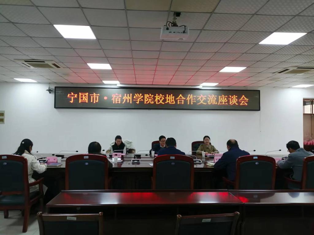 为进一步加强校地供需对接,推动大学生就业创业、社会实践、实习实训工作,助推学院高质量发展,3月28日下午,宿州学院与宁国市校地合作交流座谈会在逸夫楼第一会议室举行。宁国市委组织部副部长王欢、团宁国市委书记欧阳慧君、副书记李雪,宿州学院党委委员、纪委书记、监察专员王俊、党委组织部部长陈啸吟、教务处副处长刘超、招生就业处副处长李金莲参加了会议。座谈会由校团委书记凌峰主持。