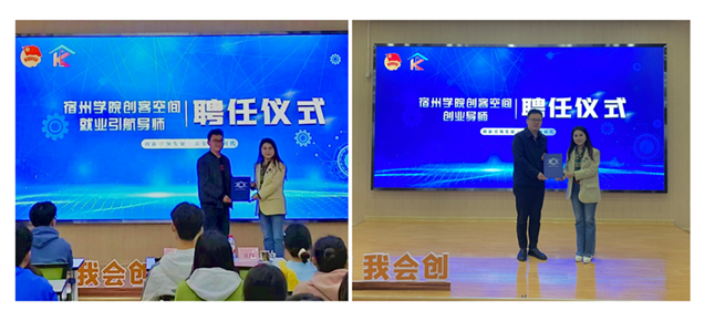 陈宇为两位主讲老师分别颁发宿州学院“创业导师”“就业引航导师”聘书。