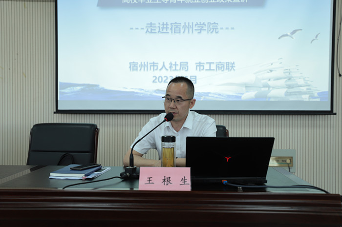 为推进学习贯彻习近平新时代中国特色社会主义思想主题教育走深走实,深入贯彻省人力资源和社会保障厅《关于开展高校毕业生等青年就业创业政策宣传月活动的通知》要求,落实就业优先战略,推进“拓岗、稳岗、服务、创业”机制,促进我校毕业生高质量充分就业。6月12日,宿州学院联合宿州市人社局、市工商联、市总工会在逸夫楼第二会议室开展“就业扬帆 政策护航”高校毕业生就业创业政策宣传活动。市人社局就业促进和失业保险科科长王根生、市工商联科长刘潇华、市就业管理中心科长范全领、市总工会接梦婷、宿州学院招生就业处处长杨刚出席活动,团委书记凌峰主持。