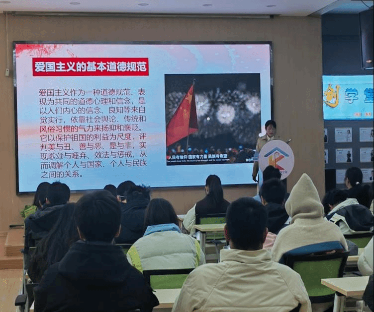讲座的最后,是王梓同学关于“新时代新青年”的讲述。她以爱国主义为话题,分四个部分为大家介绍了爱国主义的伟大转变和提升。第一部分引经据论,由古至今地探讨了什么是爱国;第二部分将爱国主义与其他概念主义进行对比,分析了爱国主义的特殊之处;第三部分从情感教育和知识教育两个方面对如何诠释弘扬新时期爱国主义精神这一问题进行了解读;第四部分她以为脱贫事业献出青春和生命的黄文秀和用自己的命换取孩子的命的杨科璋为例,讲述了怎样做新时期好青年。她强调,我们生于这个伟大的国家,更应该在自己有限的时间内,牢记属于每个人的爱国主义,坚定自己的理想信念,为爱国主义,为中华民族贡献出自己的光芒!