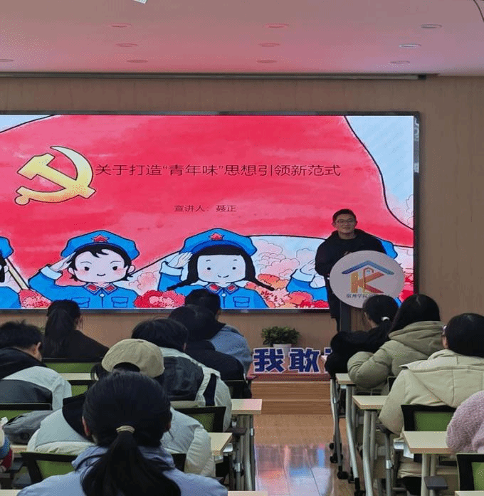青年理想远大、信念坚定,是一个国家、民族无坚不摧的前进动力。青年思想引领是共青团组织的根本任务,是塑造青年、团结青年、引领青年的重要工作。为了向广大青年传达新时代的价值观和精神风貌,打造青年味思想引领新范式,引导他们成为具有社会责任感和创造力的新一代青年。2023年11月25日,由宿州学院大学生理论宣讲团主办的青语课堂“新青年思想引领”主题讲座在创客空间二楼如期举行。本次活动由范晓婷同学主持,由聂正,徐可馨,王梓三位宣讲人进行宣讲。