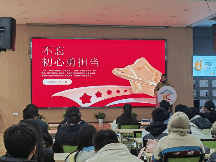 紧接着,由第二位宣讲人徐可馨同学为大家带来了主题为“不忘初心,勇担当”的宣讲。她围绕着“不忘初心再出发,牢记使命勇担当”这一中心话题从不忘初心,方得始终;牢记使命,英勇奋斗;坚定信念,永葆先进;忠诚履职,敢于担当这四个部分逐一向大家分享。她认为,青年人立足时代前沿,要牢记初心,勇于担当。于小我,不忘初心,当一路高歌一路行。于民族,不忘初心,当守民族文化之魂。于国家,不忘初心,当力保山河锦绣、国泰民安。