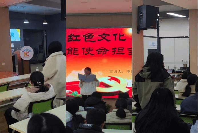 近年来,红色文化的传承越来越受到社会各界的关注和重视。红色文化是中国共产党领导中国人民在革命、建设和改革实践中所形成的宝贵财富,具有深厚的历史背景和文化内涵。它不仅代表着中国共产党的奋斗历程和精神风貌,更是中华民族优秀传统文化的重要组成部分。在这样的背景下,2023年12月2日,由宿州学院大学生理论宣讲团主办的青语课堂“传承红色文化,赋能使命担当”主题讲座在创客空间二楼如期举行。本次讲座由彭婷婷同学主持,杨勤勤,门阳阳,李世雅三位宣讲人进行宣讲。