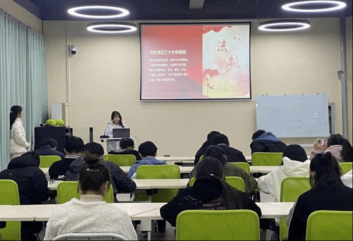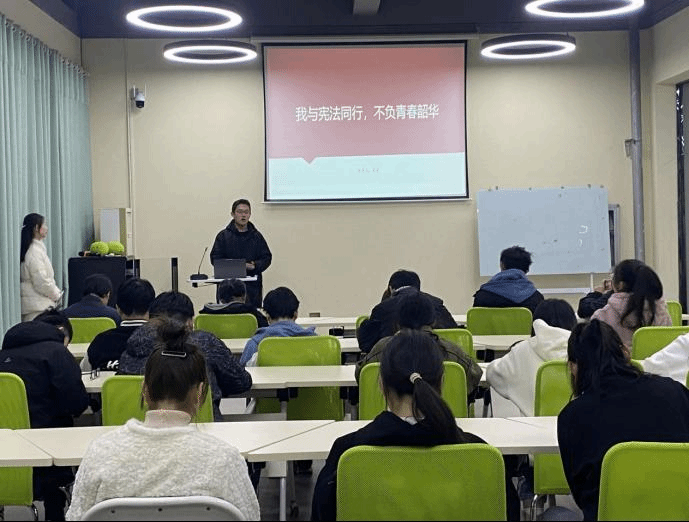 宪法是一张写着人民权力的纸,是国家的根本法。宪法的设立有其重要的目的和意义,它与我们的生活息息相关。作为青少年更应该积极弘扬宪法精神,激发强烈的爱国情感。与宪法一路偕行,不负青春韶华。在这样的背景下,2023年12月9日,由宿州学院大学生理论宣讲团主办的青语课堂“我与宪法同行,不负青春韶华”主题讲座在创客空间二楼如期举行。本次讲座由陈雨露同学主持,李菲儿、杨月月、聂正三位宣讲人进行宣讲。