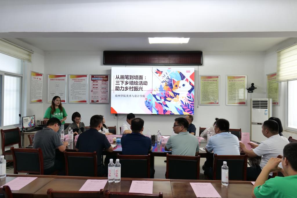 实践团队负责人还向大家汇报此次彩绘活动方案。在向大家讲述团队在来之前已做了乡村文化背景调研、了解村民需求、选择合适的彩绘地点等一系列准备工作。将结合五河县地方特色文化,让现代审美与乡村文化巧妙融合,从而提升乡村文化的知名度和美誉度。得到在场人员一直好评。
