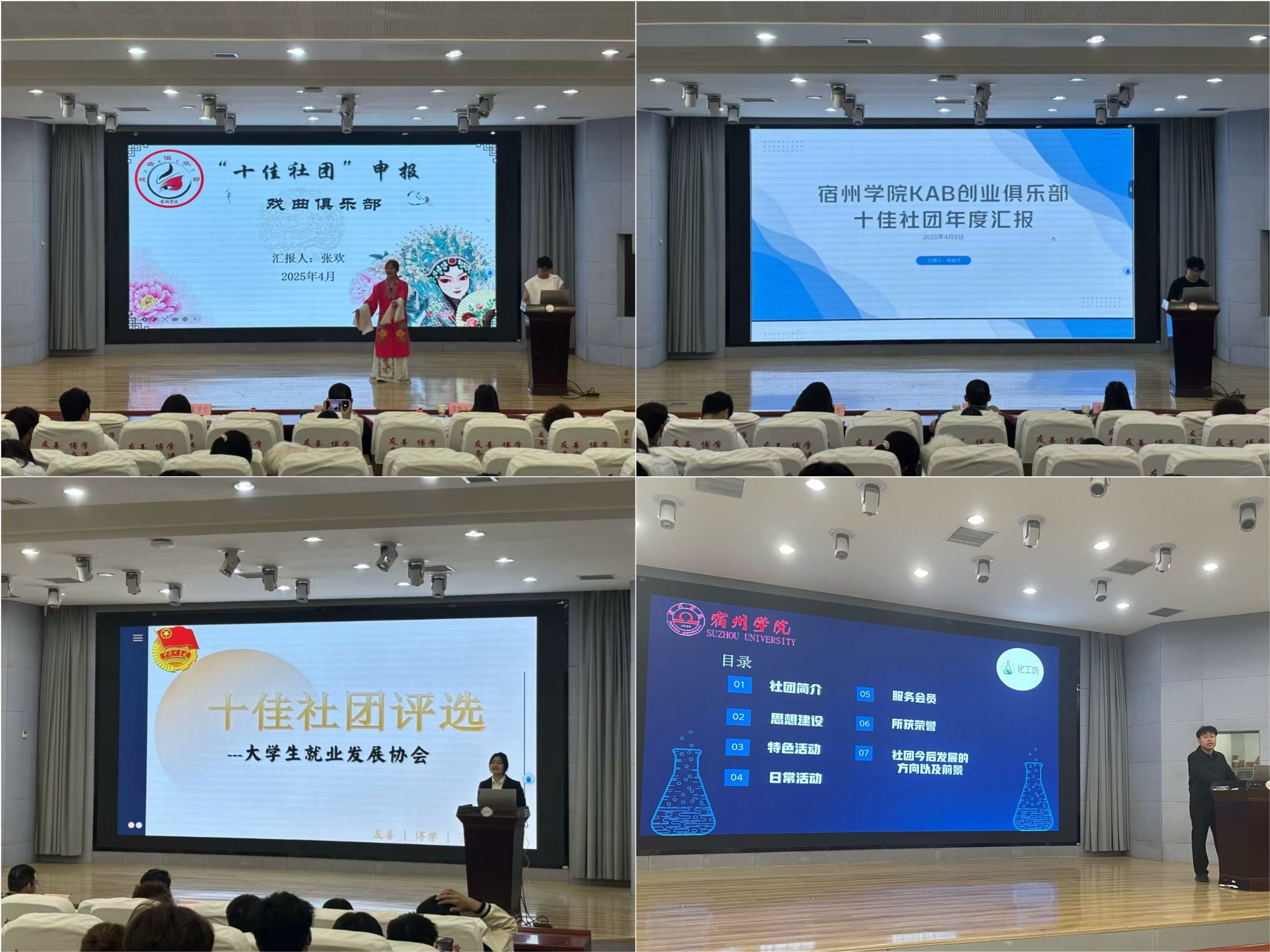 据悉,经过前期自主申报,材料初审等环节,共有16个学生社团脱颖而出,进入最终的答辩环节。答辩会上,16个社团精心准备,通过PPT展示、视频播放等多种形式,全面展示了社团的组织建设、特色活动、成员风采、育人成效以及未来发展规划等方面。每一个社团的展示都凝聚着成员们的智慧与汗水,展现了宿州学院学子积极向上的精神风貌和丰富多彩的校园生活。本次评选采取“材料评审+现场答辩”双轨制进行综合评分,评委就社团活动的创新性、影响力、团队协作等方面进行了提问和点评,给出了宝贵的意见和建议。通过激烈的角逐和公正的评选,最终评选出宿州学院2024年度“十佳社团”。