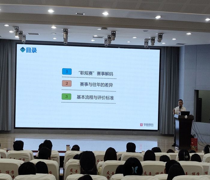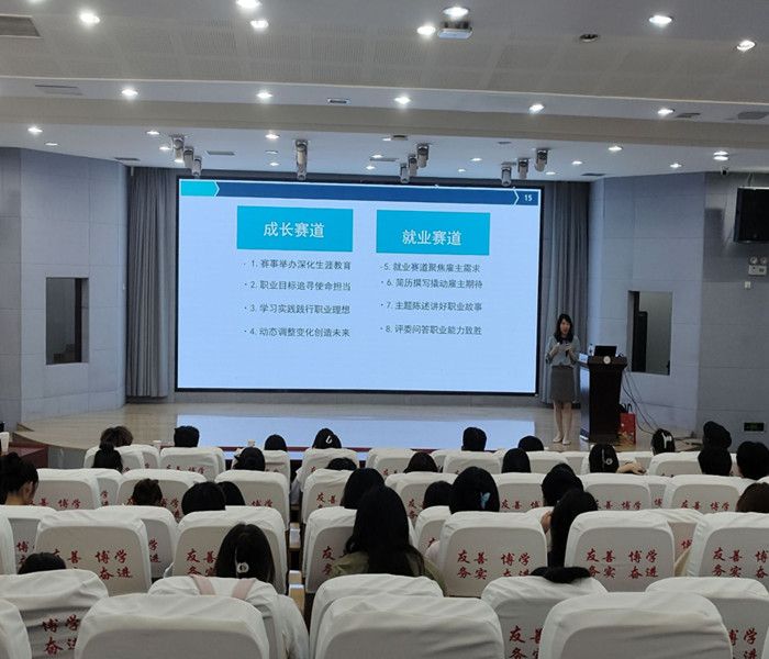 安徽华图教育师资教研主任陈祝红、宿州市职业指导大师工作室项目负责人赵丽莎,作为主讲嘉宾,围绕大赛要点,结合具体案例向同学们讲解了备赛技巧与策略。陈祝红做了题为《职业规划大赛-大学生就业指导》的讲座,从“职规赛”赛事解码,赛事与往年的差异,基本流程与评价标准三方面展开讲解,详细介绍了参赛过程中需要注意的关键事项,就如何准备相关材料、提高竞争力等方面给出了专业建议。赵丽莎做了题为《职业规划大赛要点分析与备赛攻略》的讲座,从为何“赛”、“赛”什么、如何“赛”三方面,围绕大赛要点,结合具体案例向同学们讲解了备赛技巧与策略。
