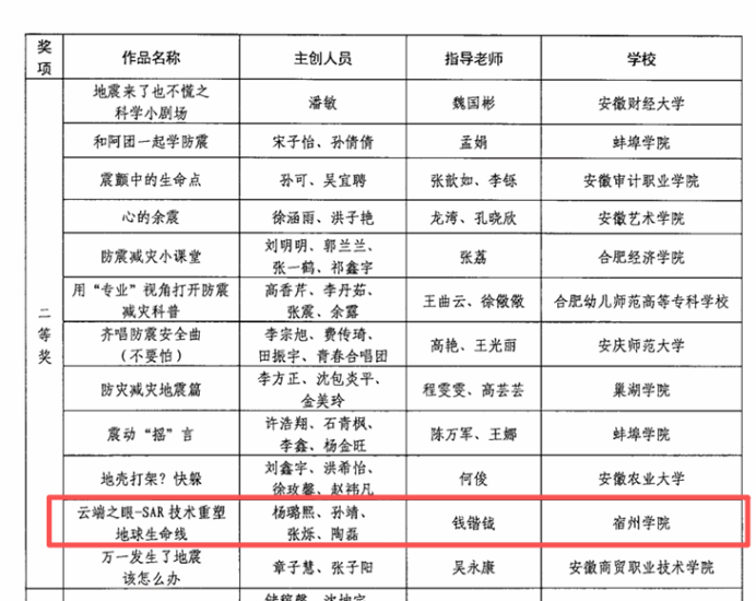 我校将以此次获奖为契机,继续鼓励和支持师生发挥专业特长,创作出更多优秀的科普作品,积极参与社会服务与科普宣传活动,为全面提升公众科学素质、筑牢防灾减灾救灾的人民防线贡献宿州学院的智慧与力量。