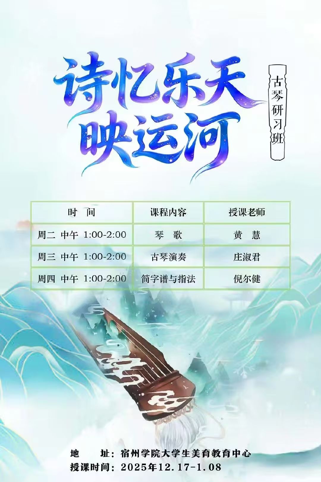 近日,宿州学院大学生美育教育中心正式启动古琴艺术传承人计划,“诗忆乐天映运河”古琴研习班同步揭牌开班。此次活动恰逢2024年12月古琴艺术入选宿州市非物质文化遗产重点保护项目的重要节点,成为该校践行“4510”校地文旅协同发展战略、深化产教文旅双融合的创新实践样本。