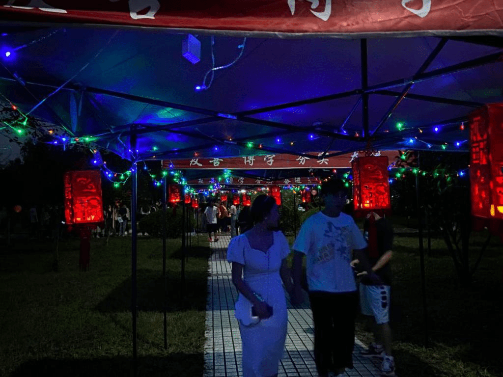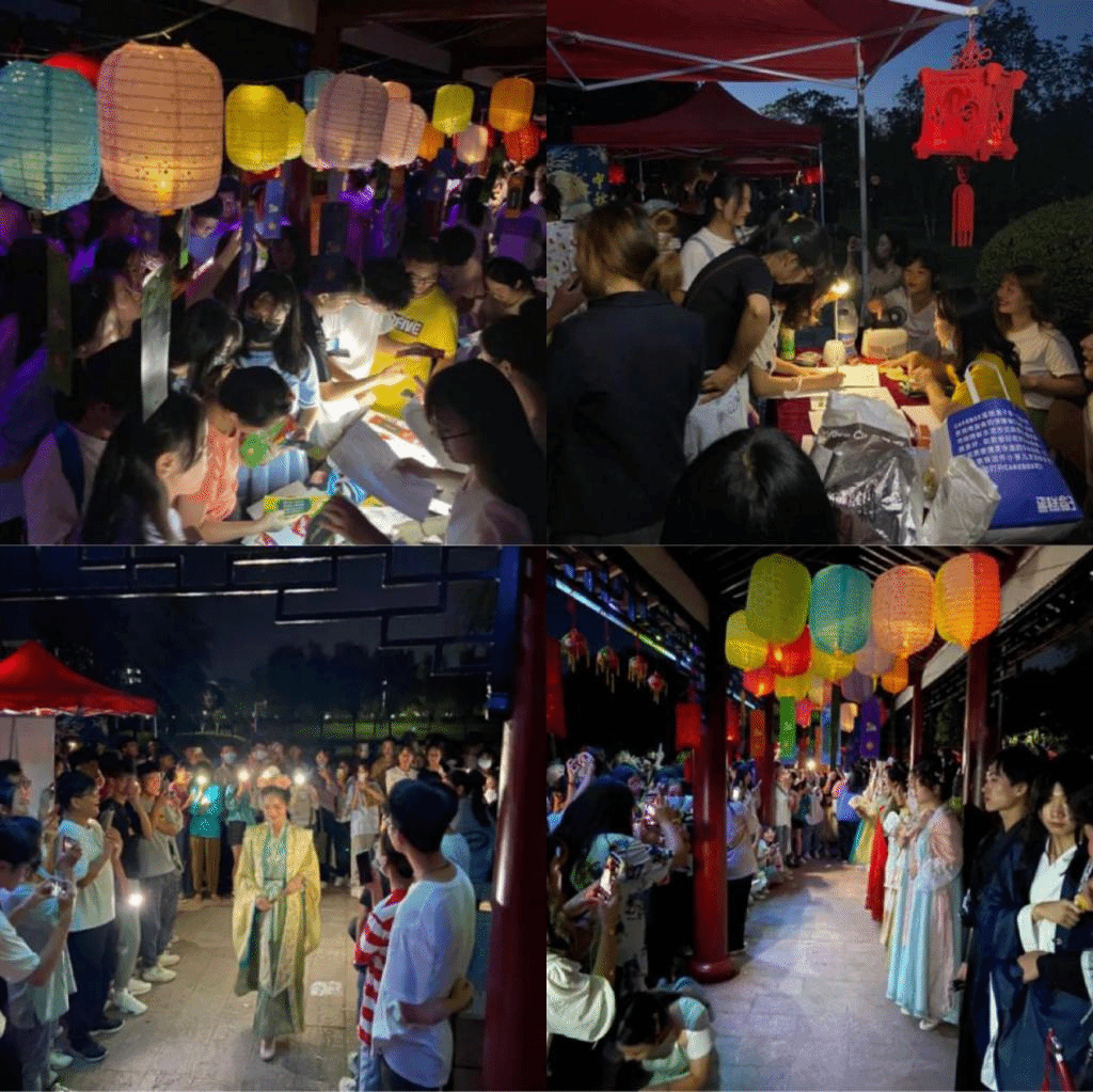 沿赛亭至二冬大道一线往东行,伴随着一盏盏灯笼的亮起,天文协会与人文地理科学协会共同举办“中秋望月”活动,试问“江畔何人初见月,江月何年初照人”?向前,“但愿人长久,千里共婵娟”。映入眼帘的是青春风文学社的“月诗风吟”活动,借着月色对家人表达思念;蓦然侧目,“水中月是天上月,眼前人是心上人”国学学会与文史学会正在赛亭长廊上“汉服游园”;月饼是承载优秀传统文化的美食,既可以使人们享受甜蜜,也可以相互馈赠联络感情。食品科学协会的“中秋DIY”活动正好给了传递温暖的机会。岔路口往右,径直到露天广场,戏曲俱乐部的“戏曲联唱”与天籁吉他社的现代音乐相互碰撞,迸发出令人惊羡的魅力。民俗学社的灯谜、英语学会的忆月、锵锵茶艺社的品茗、舞蹈社团的舞动中秋、益起来爱心社的情浓中秋、大学生就业发展协会的知识问答……。
