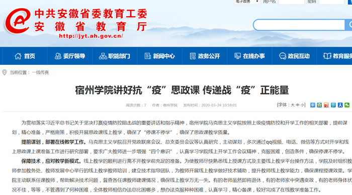 3月25日,《安徽教育网》以《宿州学院讲好抗“疫”思政课 传递战“疫”正能量》问题,对我校马克思主义学院讲好抗疫故事,上好思政课的消息进行了报道。