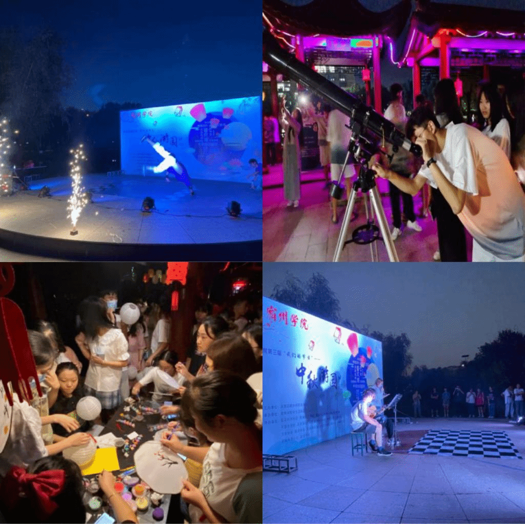 沿赛亭至二冬大道一线往东行,伴随着一盏盏灯笼的亮起,天文协会与人文地理科学协会共同举办“中秋望月”活动,试问“江畔何人初见月,江月何年初照人”?向前,“但愿人长久,千里共婵娟”。映入眼帘的是青春风文学社的“月诗风吟”活动,借着月色对家人表达思念;蓦然侧目,“水中月是天上月,眼前人是心上人”国学学会与文史学会正在赛亭长廊上“汉服游园”;月饼是承载优秀传统文化的美食,既可以使人们享受甜蜜,也可以相互馈赠联络感情。食品科学协会的“中秋DIY”活动正好给了传递温暖的机会。岔路口往右,径直到露天广场,戏曲俱乐部的“戏曲联唱”与天籁吉他社的现代音乐相互碰撞,迸发出令人惊羡的魅力。民俗学社的灯谜、英语学会的忆月、锵锵茶艺社的品茗、舞蹈社团的舞动中秋、益起来爱心社的情浓中秋、大学生就业发展协会的知识问答……。
