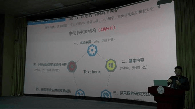 通过前三章内容的铺垫,王士权逐渐把讲座引入到了重点,生动的提出了“4W+H”概念,并紧密结合一篇硕士学位论文,详细讲解了立项申报书的五大结构(立项依据Why、基本内容What、拟采取的研究方法和技术路线How、研究进度和预期成果When、完成本项目可行性分析Who)