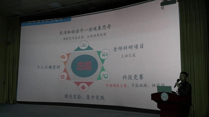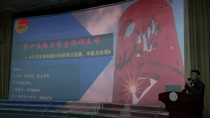 紧接着王士权详细为同学们讲解了如何从“生活和社会中一些现象思考、老师在研项目、科技竞赛、课内实验和集中实践、个人兴趣爱好”五个方面进行科研选题。