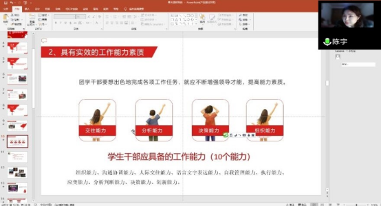 为深入贯彻落实习近平总书记青年工作思想和中央党的群团工作会议精神,进一步加强新形势下学生团干部队伍建设,引导学生团干部树立做好团学工作的荣誉感、责任感和使命感,更好地发挥团组织作为联系青年团员的纽带作用,完成好培养中国特色社会主义事业合格建设者和可靠接班人的根本任务,校团委于1月22日通过腾讯会议平台举行第十九期星火团校学生团干部培训班。全校2021级各班团支书以及团委学生委员办公室学生干事参加了本次培训。