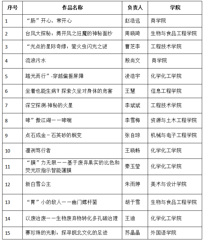 根据省科协、省教育厅、团省委主办的《第十五届安徽省百所高校百万大学生科普创意创新大赛》(以下简称双百大赛)的要求,经团队注册、网上报名、专家评审等环节,已顺利完成校赛选拔,根据上级要求推荐15件作品参加省赛,现将结果公示如下: